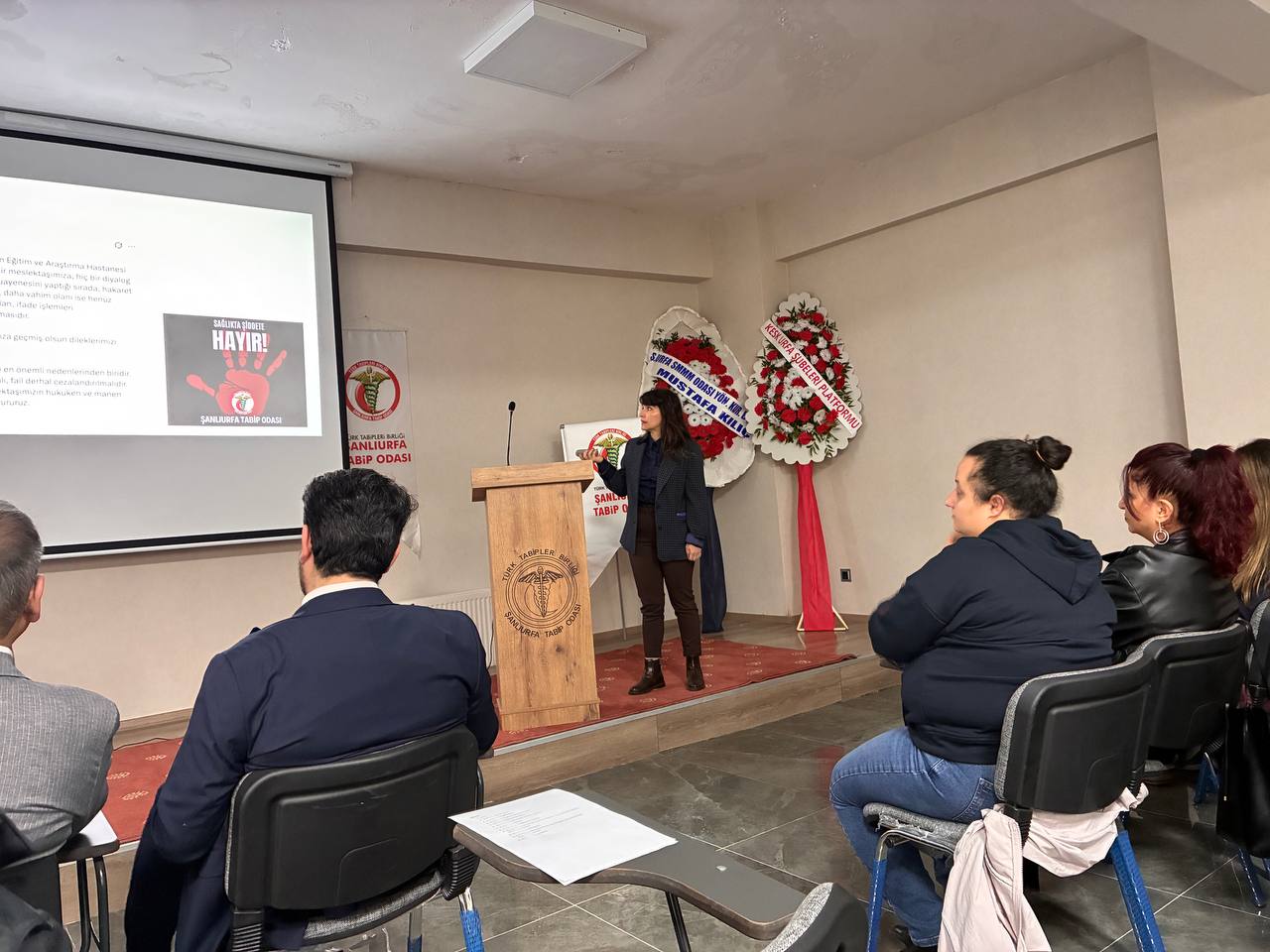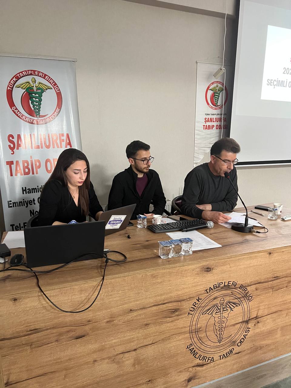 Açılış konuşmasını Şanlıurfa Tabip Odası Başkanı Dr. Fırat Erkmen gerçekleştirdi. Katılımcı kurum temsilcilerinin kısa selamlama konuşmalarının ardından, Şanlıurfa Tabip Odası Genel Sekreteri Dr. Derya Bulgur tarafından 2024-2026 dönemi Yönetim Kurulu çalışma raporu sunuldu.