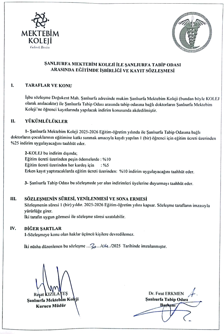 Şanlıurfa Tabip Odası Olarak Şanlıurfa Mektebim Koleji ile Üyelerimiz İçin İndirim Protokolü İmzalanmıştır.